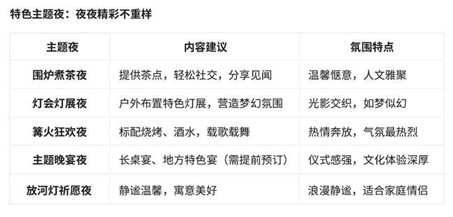 · 全程夜间活动:所有晚间主题活动(篝火、煮茶、主题晚宴等)