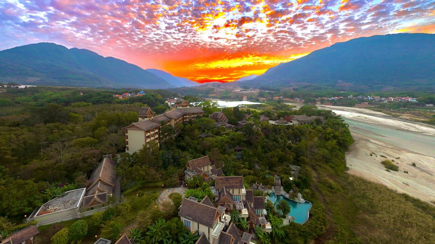 坐落于景区内的翡华温泉度假酒店依江畔而建的主楼建筑群加之别墅,整体建筑形态体现了当地民族文化与东南亚文化的融合。在设计之初就融入了自然?;さ睦砟?,认真衡量建筑和自然之间的密切关系,设计上巧妙运用了原生的树木,尊重自然、融入自然,使整个酒店藏在山间、隐没林中,建筑物与自然景观融为一体,叠级式的建筑让人饱览无垠的瑞丽江及山河田园风光。