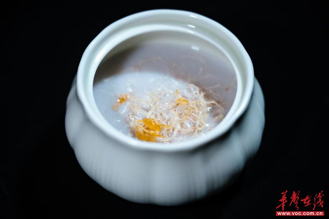 在菜品设计上,晚宴充分挖掘马王堆汉墓出土的《五十二病方》《养生方》等典籍中的食疗理念,并结合出土食物文物,如牛、羊、枣、姜、花椒等食材,进行了现代演绎。例如本次宴会的汤羹类菜品“香芋牛白羹”,灵感来源于《五十二病方》中“骨汤煮米”的思路,以牛骨、鸡脚熬制高汤为底,加入牛肉粒、干贝丝,最后撒上炸芋头丝,口感醇厚、营养丰富。