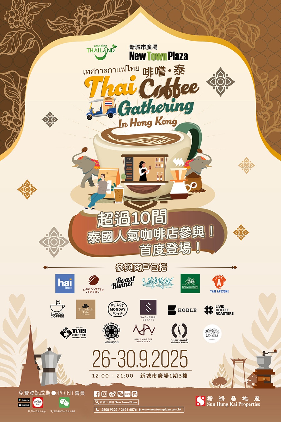 9月26日至30日,新城市广场与泰国政府旅游局(香港)携手举办5日限定咖啡盛会【Thai Coffee Gathering】,带大家由曼谷街头走到清迈雨林,一站式体验泰式咖啡风情!市集将云集17间泰国人气咖啡店及种植园,包括网红品牌Feast Monday、Koble Coffee、Ministry of Roaster、Coffee De Hmong、Anna Coffee Roasters、Traveler's Tale Tea House等,多位曾夺得国际或泰国咖啡大赛殊荣的得奖者和咖啡专家将越洋坐阵,现场分享咖啡知识;大家可即场试饮及购买得奖咖啡,同场亦有期间限定泰国得奖精品咖啡品测工作坊及正宗泰式咖啡Es Yen体验工作坊,带领大家深入了解泰国咖啡文化,周末期间更有音乐表演,让大家的咖啡之旅更添惬意。