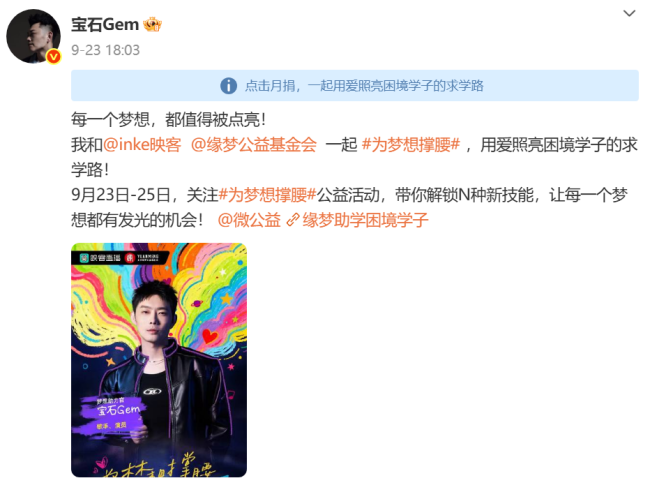 此次公益活动,映客直播集结了8位明星嘉宾与6位映客人气主播,共计14位公益使者,以直播连线、自媒体发声等形式,共同为困境学子发声。其中,宝石Gem、后弦、张赫煊三位明星嘉宾通过微博形式,为公益宣发助力,用他们的影响力呼吁更多人关注教育公益事业。
