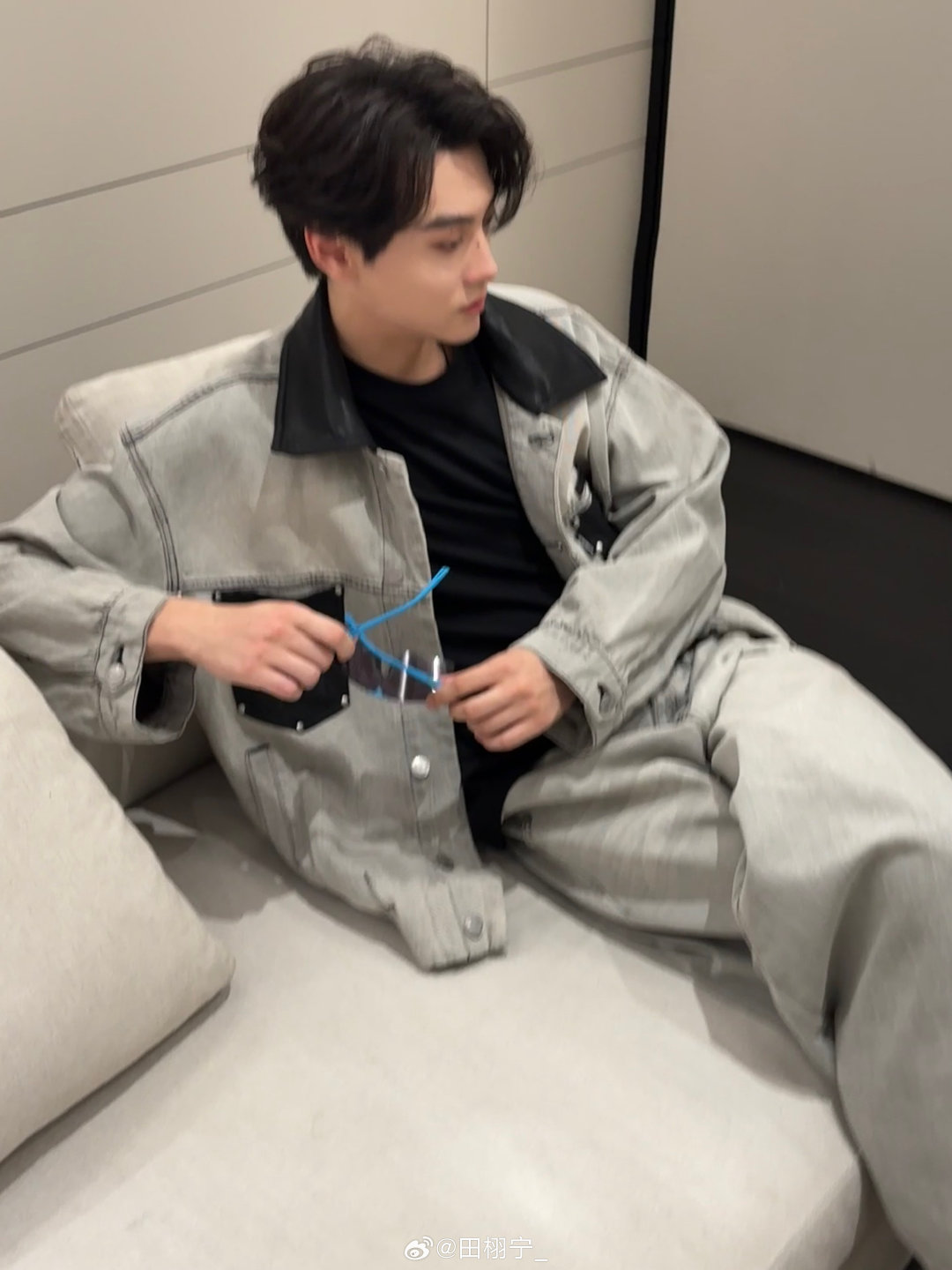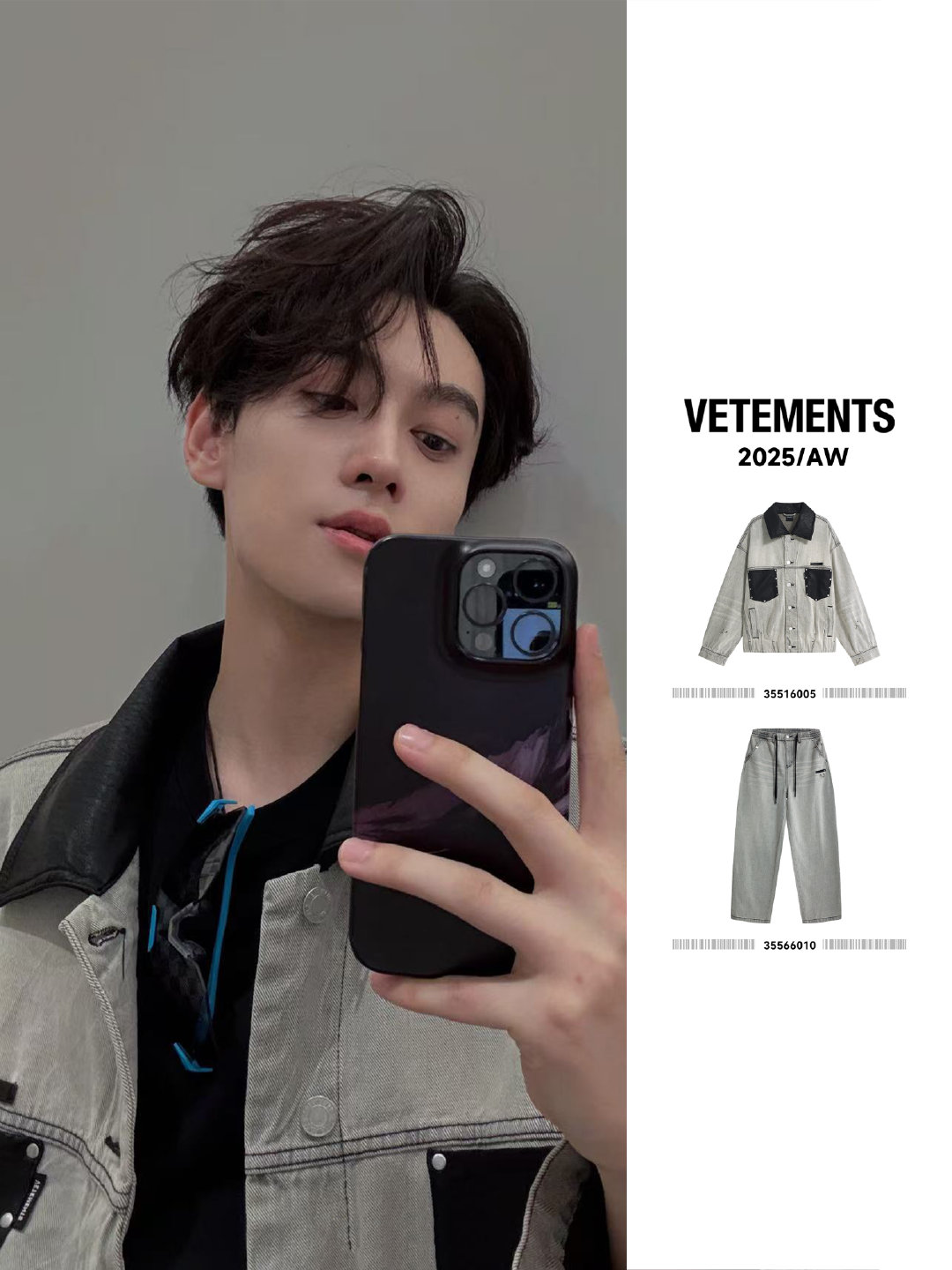 新生代流量田栩宁私服上身VETEMENTS25秋季新款拼皮牛仔套装,牛仔拼皮翻领外套/裤装,水洗丹宁兼具复古与率性,演绎初秋慵懒。