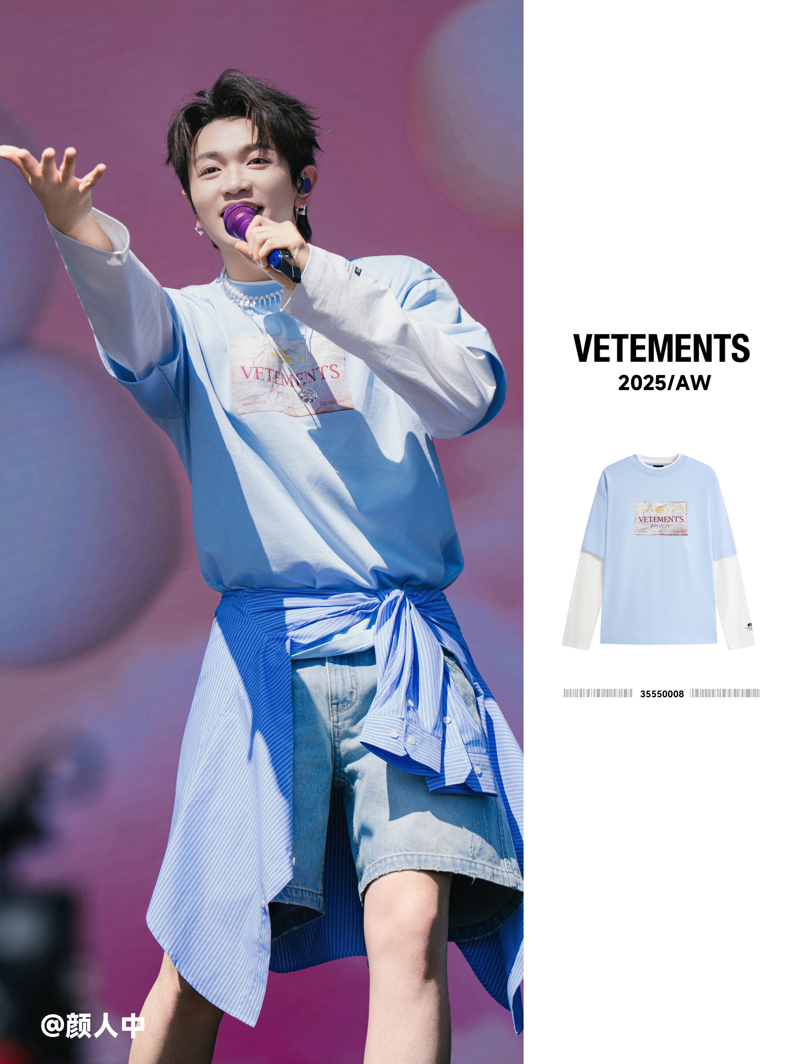 音浪席卷舞台,颜人中穿着VETEMENTS 25AW长袖T恤强势抢镜。假两件设计巧构视觉层次,月石蓝清透如夏日微风,搭配标志性品牌印花低调点睛。不靠夸张造型,仅凭质感与剪裁,在万人瞩目的舞台上自成焦点——简约,但从不简单。