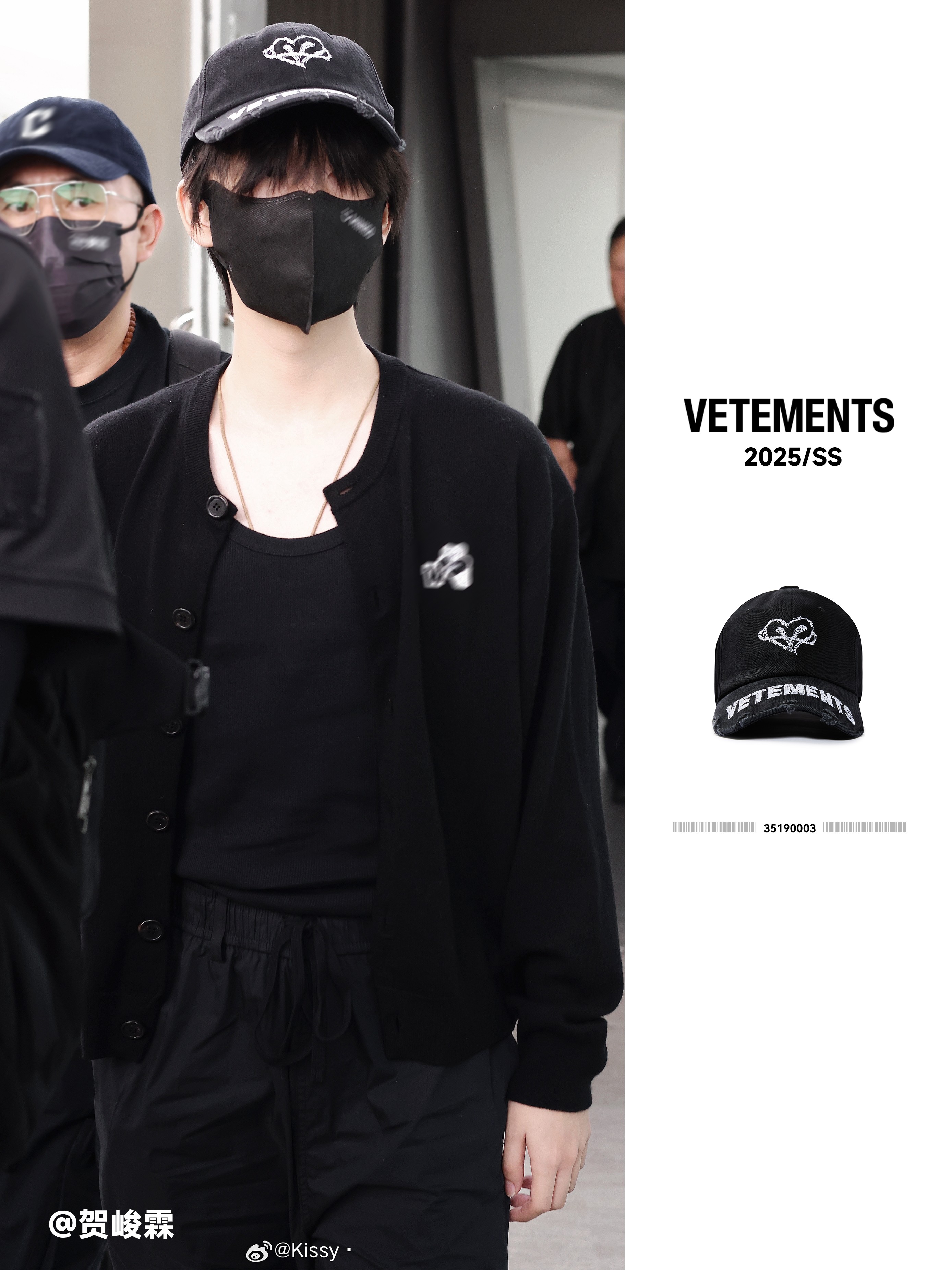 少年出街,气场全开。贺峻霖上头VETEMENTS 25SS黑色鸭舌帽,爱心刺绣暗藏温柔叛逆,做旧磨损细节诉说“未完成”的美学张力。无需多言,帽檐一压,Bking氛围直接拉满。这是属于Z世代的酷——有态度,不喧哗。