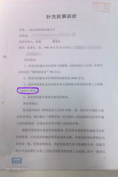 但实际上,“227亿”只是一个荒诞的笔误。2011年,陈楚生经纪人公布的《补充民事诉状》显示,天娱传媒要求的赔偿包括解约赔偿金700万元、预期利益赔偿金2000万元以及第三方索赔2268517万元。