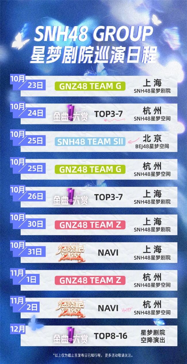 10 月至 12 月,星梦剧院巡演覆盖上海、杭州、北京等多个城市,既有 SNH48 星梦剧院的常规公演,也有 BEJ48 星梦空间、SNH48 星梦空间的特色演出,更将 “第十一届年度金曲大赏”“燃烧吧团魂第二季” 等 IP 活动与巡演结合,例如 GNZ48 TEAM G、TEAM Z 将带着 “金曲六赏” 主题登陆舞台,让巡演不再是单一的歌曲表演,而是融入了经典 IP 的主题化呈现。