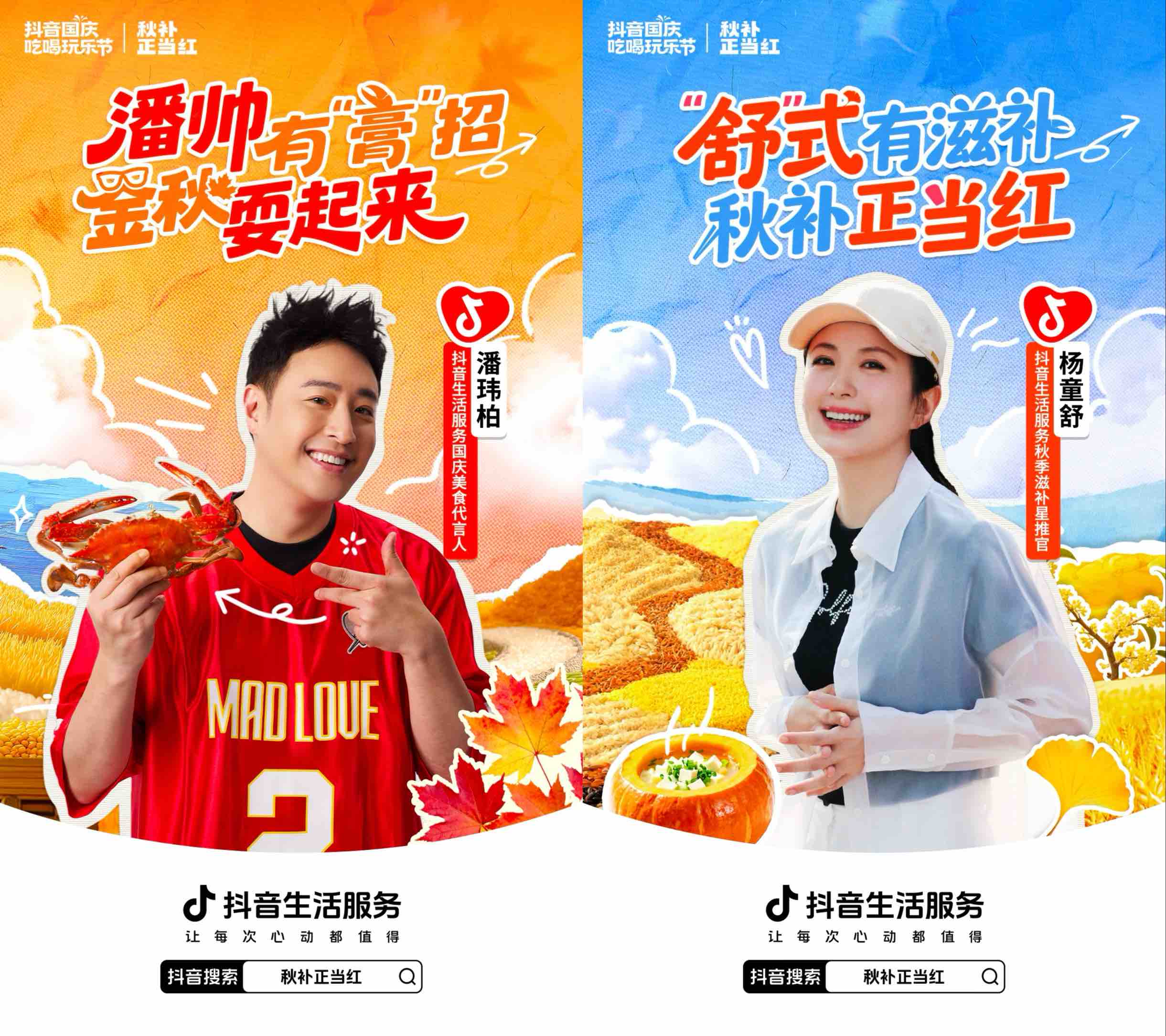 基于国庆中秋双节节点,为了更好透传“秋补正当红”活动心智与注入品类热度,满足用户对于滋补养生的多元化需求,抖音生活服务特邀@潘玮柏、@杨童舒 等明星艺人,结合主题率先发声,奠定秋补声量。