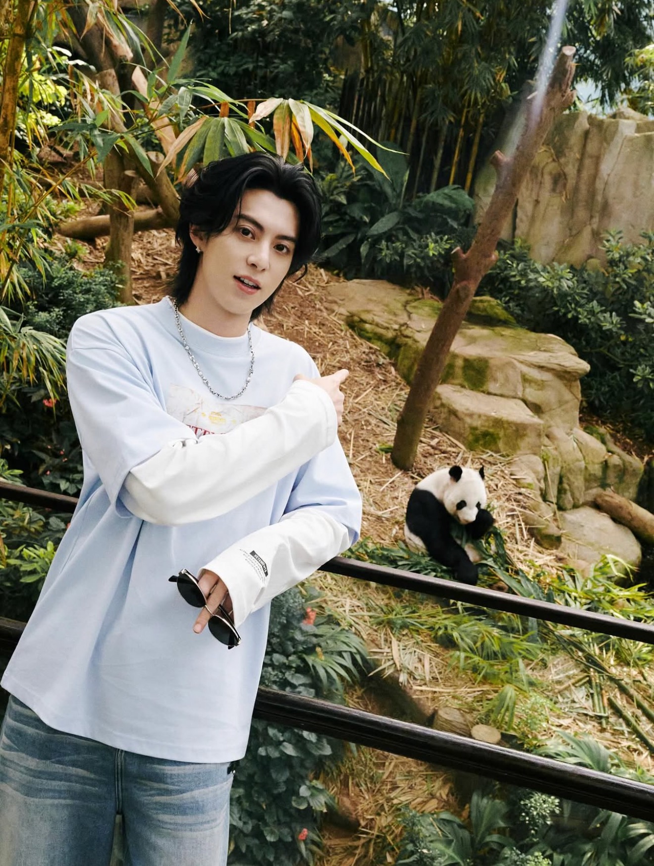 没有过多复杂的配饰点缀,微长发造型,为这身潮流look增添了几分不羁的少年气,在早秋与大熊猫的背景下,散发出一种温暖、自然而又充满活力的气息。