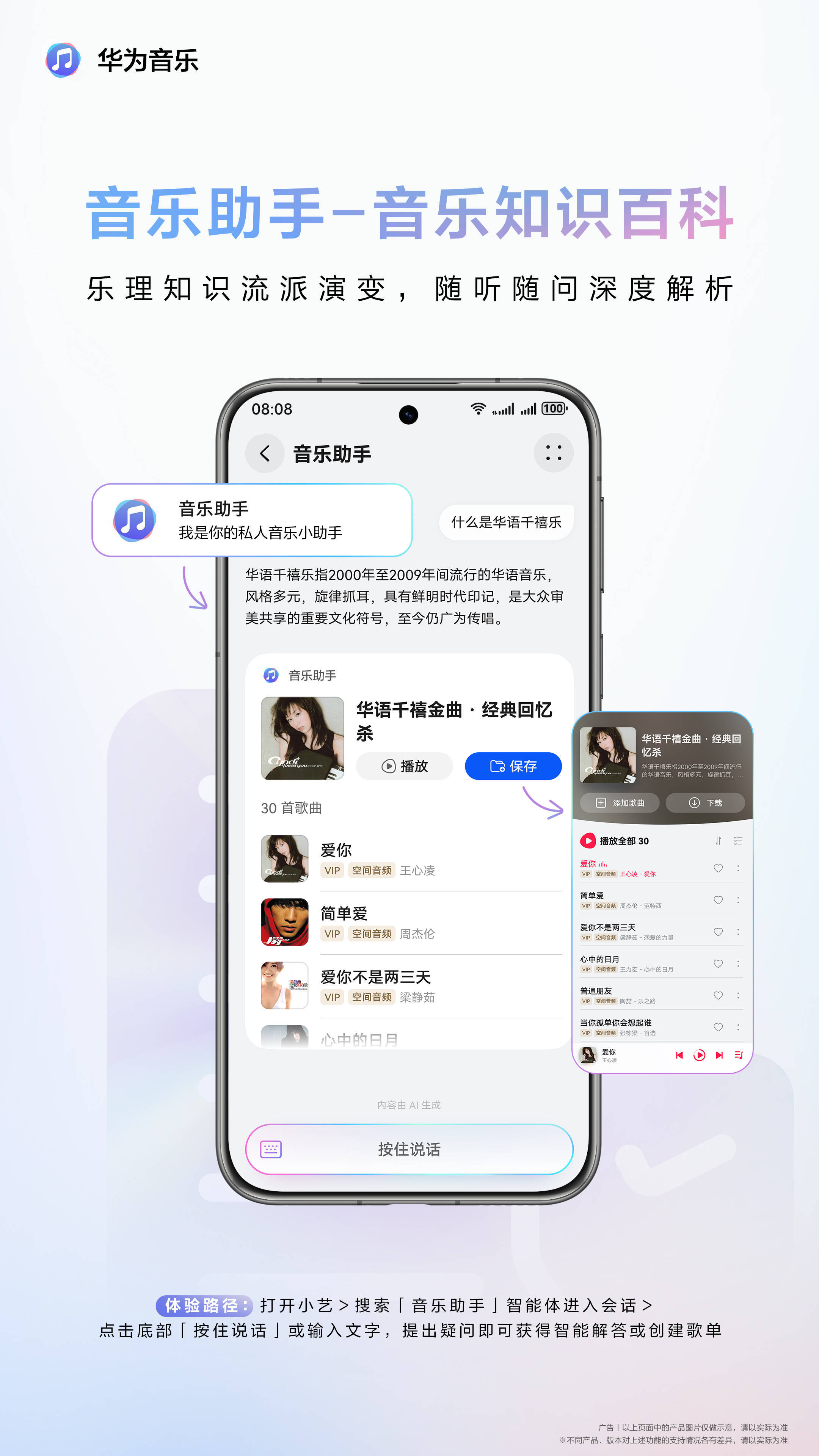 对于音乐爱好者来说,了解歌曲背后故事往往能让听歌体验更加丰富?;衾秩峦瞥龅摹耙衾种栋倏啤惫δ馨选耙衾掷鲜Α弊敖只?,专业的音乐垂域知识库可以为用户解答涵盖歌曲创作背景、乐曲解析、古典结构分析、艺术家生涯、流派演变乃至幕后制作故事等专业内容。当你听到一首感兴趣的歌曲时,前往小艺智能体广场找到音乐助手,问一句“这首歌的创作背景是什么”“这位歌手还有哪些代表作”或具体问出“什么是华语千禧乐”等,它能迅速给出清晰易懂的解答,并同步推送相关的歌曲列表,歌曲同样能一键保存至华为音乐,成为你的自建歌单。这种“边听边学”的体验,让音乐小白也能轻松秒懂,深度感受音乐的魅力。