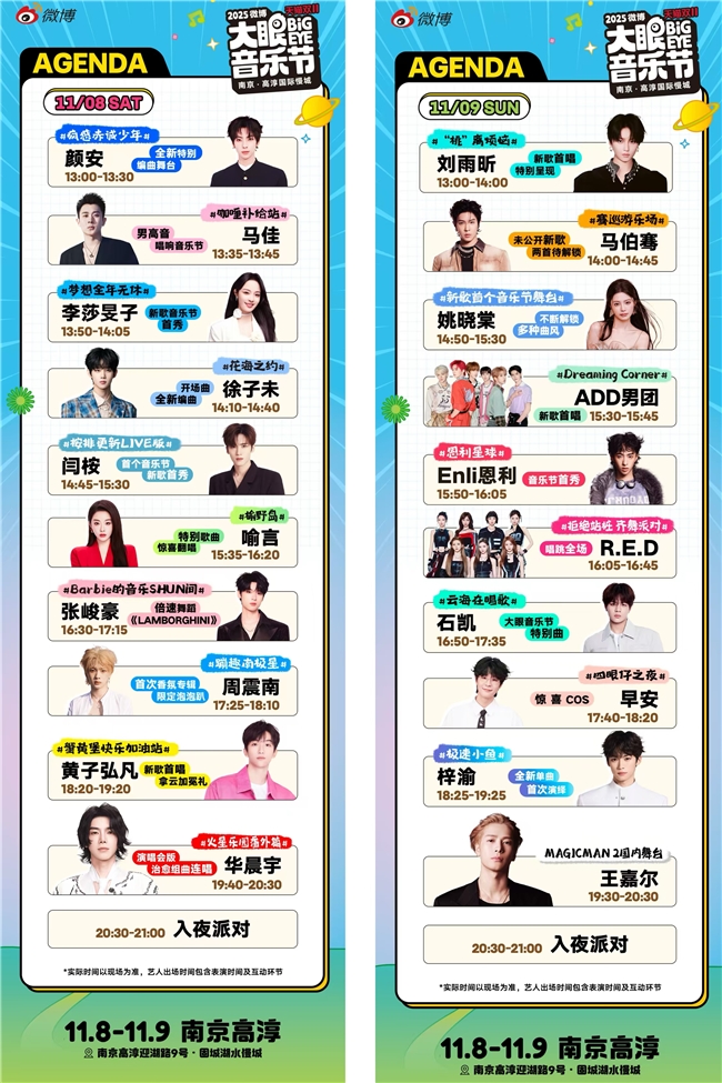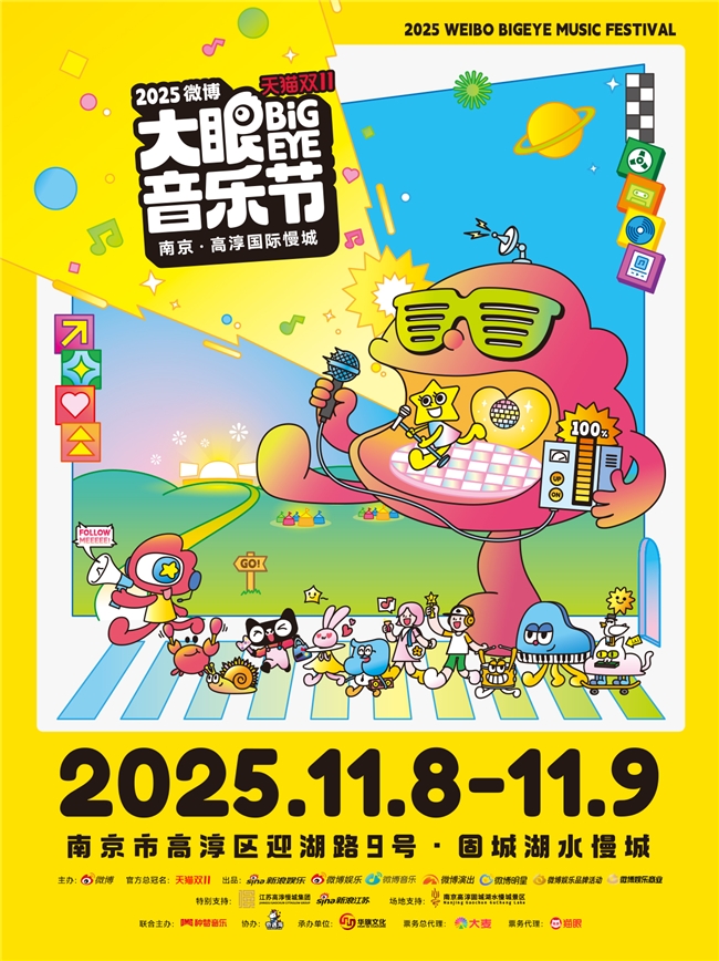 近日,中国社交媒体巨头微博联合中国顶尖说唱音乐公司种梦音乐D.M.G主办的首届「微博大眼音乐节」官宣豪华明星阵容及演出时间表,华晨宇、王嘉尔惊喜呈现,黄子弘凡、李莎旻子、马佳、徐子未、闫桉、颜安、喻言、张峻豪、周震南、ADD男团、恩利、刘雨昕、马伯骞、R.E.D、石凯、姚晓棠、早安加盟,目前音乐节预售已开启,在大麦、猫眼平台火热售票中。2025年11月8日至9日,在南京市高淳区迎湖路9号·固城湖水慢城,集结全明星阵容的视听盛宴——「微博大眼音乐节」,即将掀起一场高能量高沉浸的LIVE演出狂欢。