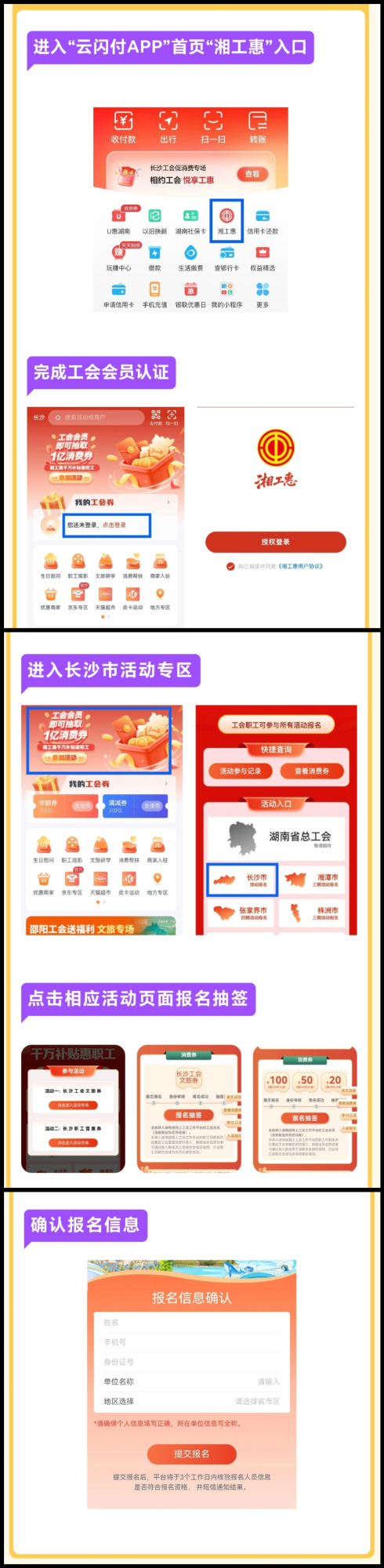 活动采用“先报名再抽签”的形式,会员可登录“云闪付”APP—“湘工惠”小程序报名,报名持续至11月25日,11月28日公开摇号。