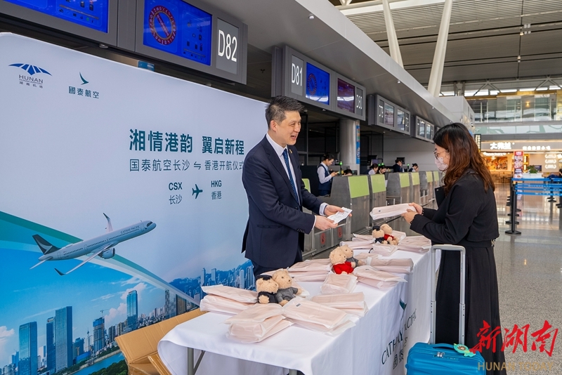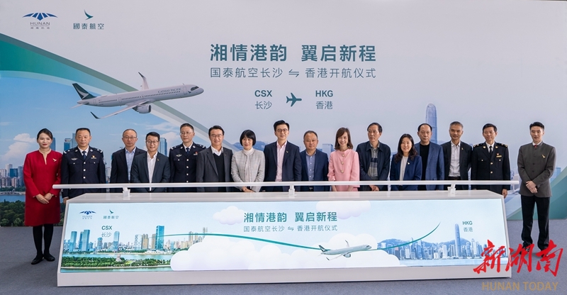 11月4日,国泰航空CX968航班从香港起飞,顺利落地长沙黄花国际机场,标志着国泰航空香港往返长沙航线正式通航,为湖南及华中地区与粤港澳大湾区架起高效便捷的“空中桥梁”。该航线每日一班,全程飞行时间仅为1小时40分钟。新航线的开通将进一步助力湘港两地在经贸、旅游、文化等领域的交流与合作。图为国泰航空举行开航庆祝仪式。湖南日报全媒体记者 童臻熙 于淼 摄影报道