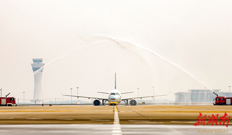 11月4日,国泰航空CX968航班从香港起飞,顺利落地长沙黄花国际机场,标志着国泰航空香港往返长沙航线正式通航,为湖南及华中地区与粤港澳大湾区架起高效便捷的“空中桥梁”。该航线每日一班,全程飞行时间仅为1小时40分钟。新航线的开通将进一步助力湘港两地在经贸、旅游、文化等领域的交流与合作。图为机场以民航最高礼遇“过水门”仪式迎接首航航班。 湖南日报全媒体记者 童臻熙 于淼 摄影报道